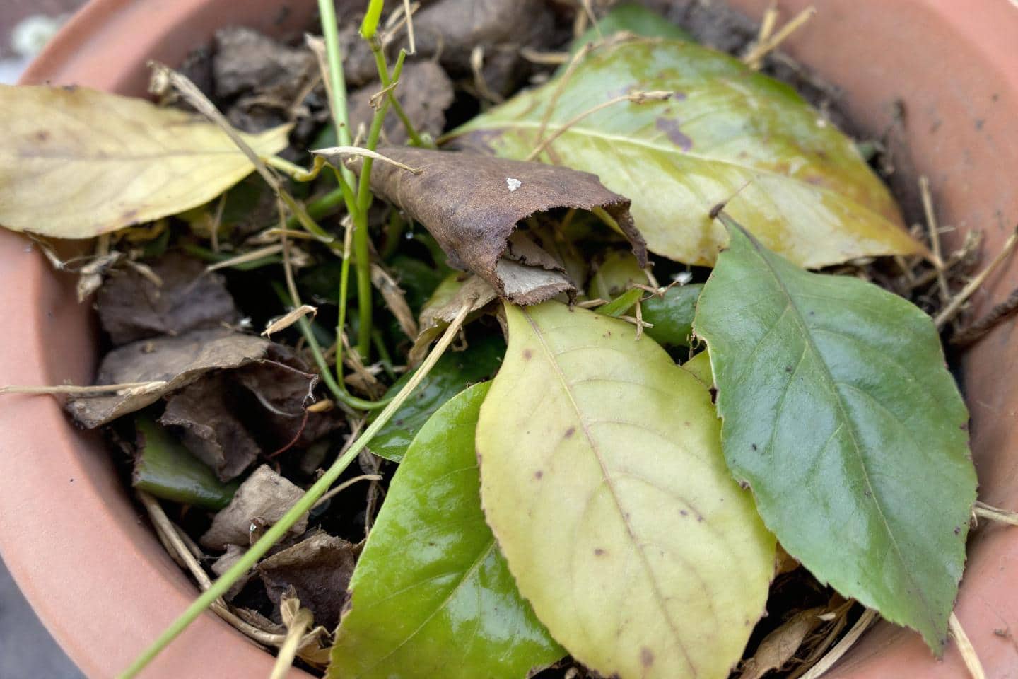 - 3 à 4 poignées de déchets verts : épluchures, fanes, restes de tonte, petites tailles de vivaces